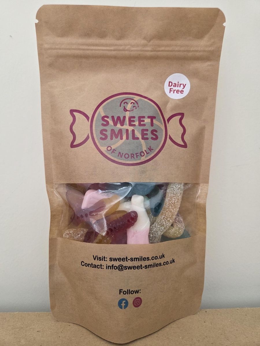 Dairy-free fruit flavour jelly / fizzy / foam sweet pouch. A delightful mix of some of our favourite dairy free sweets.