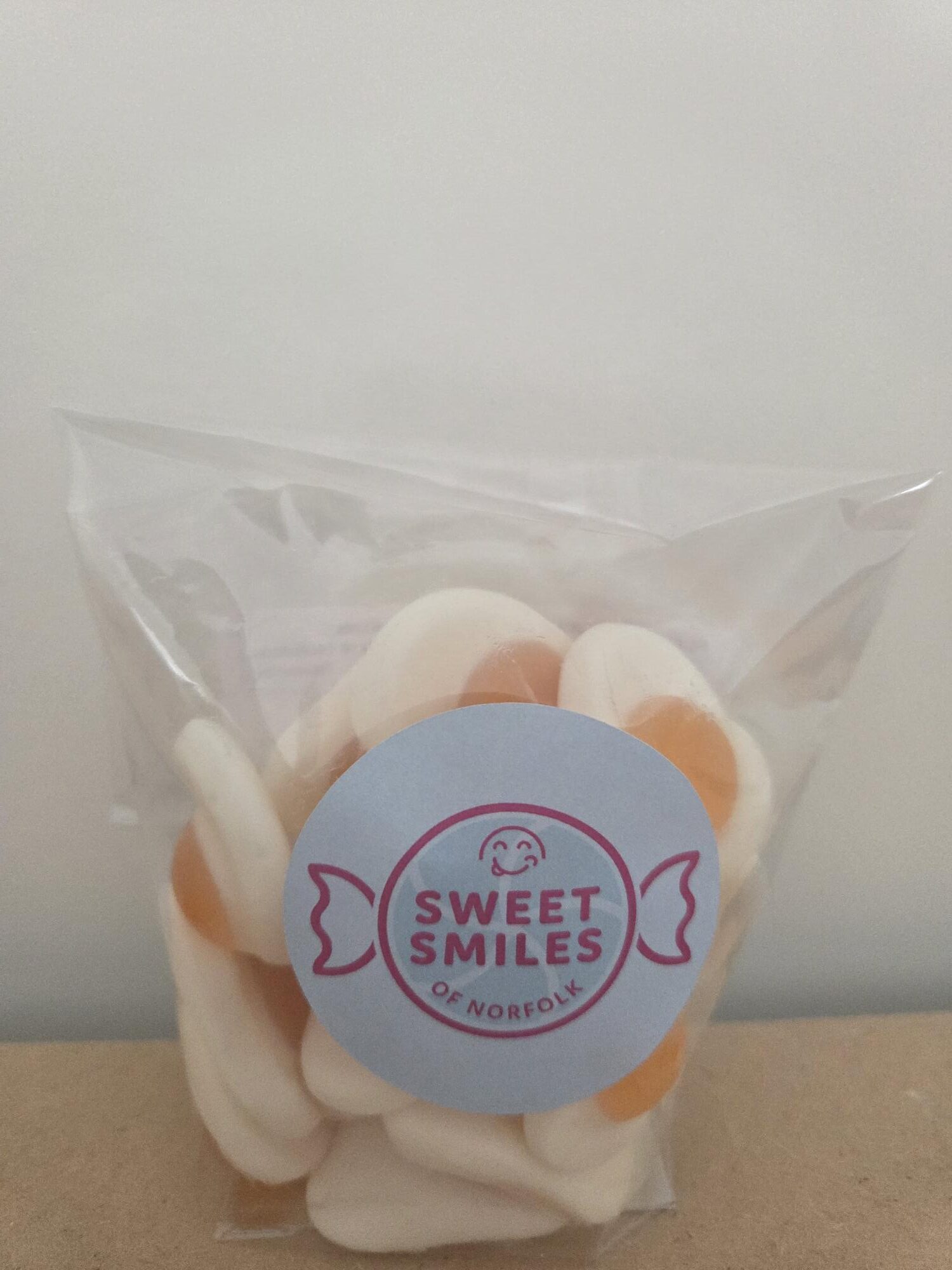 Fried Eggs bag – 120g. A fun selection of soft, fruity fried egg gummies with their classic white and yellow look. Sweet, chewy, and a favourite pick for any sweet lover.