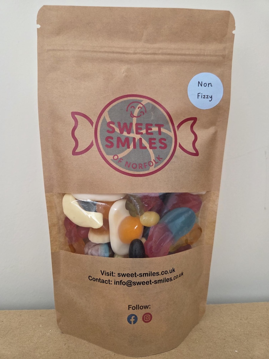 Non fizzy fruit flavour gummy / jelly / foam mix sweet pouch. Our non fizzy mix contains a delicious selection of our best traditional and modern classics and some surprises too.